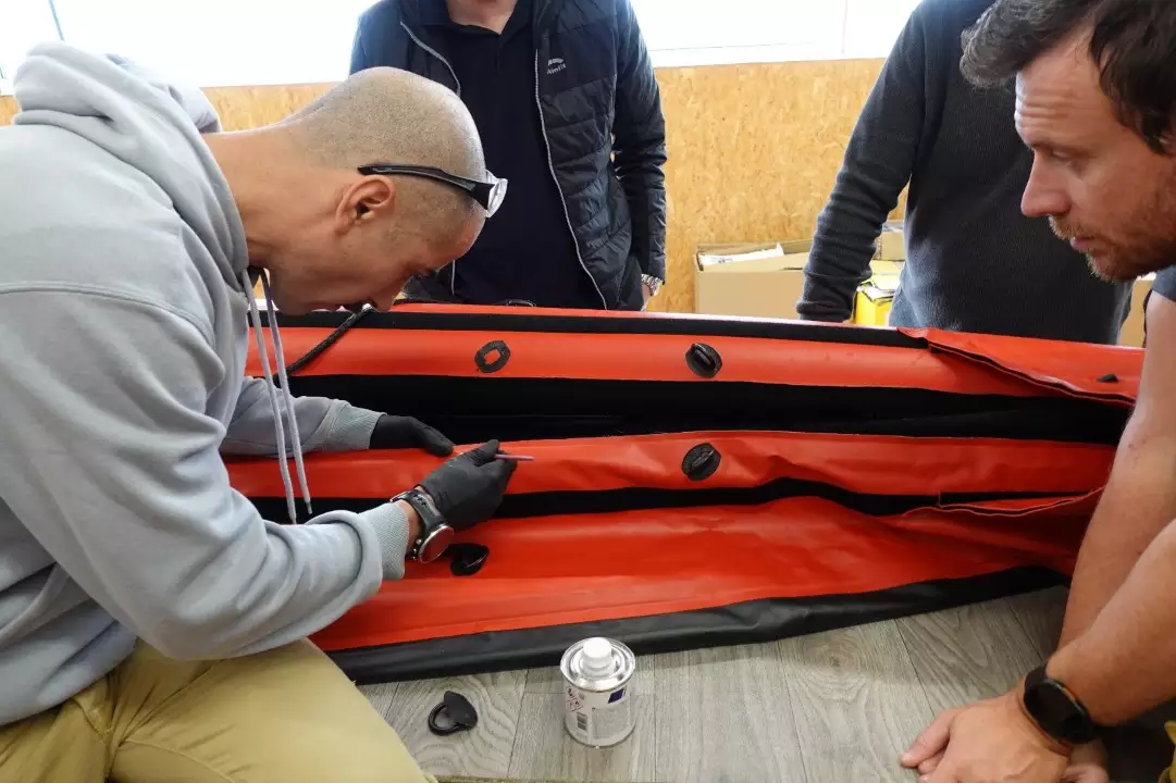 - Außenhaut Flicken: Sollte der Boden unterwegs geflickt werden, sollten die selbstklebenden Flicken beidseitig angebracht werden (innen und außen). Diese doppelte Versiegelung verhindert, dass Wasser zwischen Material und Flicken dringt.